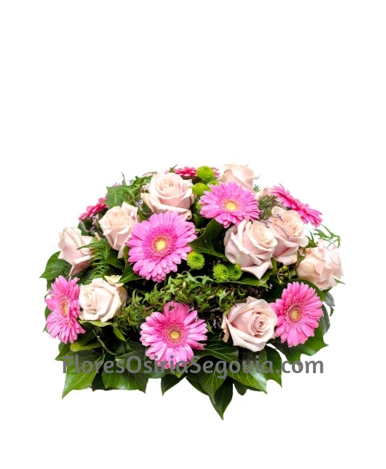 Bonito y elegante, este Centro Funerario Esperanza de flores para entierro para entrega en los Tanatorios de Segovia. Es un centro de flores para tanatorio, de flores para difuntos variadas, en tonos rosados, confeccionado con rosas, gerberas, margaritas de botón verde y verdes variados que le dan al centro un toque dulce y delicado. Nuestros centros de flores para fallecido se envían a los Tanatorios como muestra de cariño, aprecio y acompañamiento para la familia de la persona fallecida. Este centro de flores para funeral es un producto de total calidad, con flores frescas suministradas todos los días por nuestros proveedores, tanto nacionales como internacionales. Por lo que lo elaboramos lo más parecido posible o a gusto del cliente. Nuestros trabajos de flores para funeral, están siempre realizados con flores para difuntos y verdes de primera calidad. Estas flores para entierro son suministrados tanto por proveedores nacionales, como internacionales. Son centros de flores para fallecido efectuados de forma totalmente artesanal por nuestros floristas. Somos floristas profesionales, formados, por lo que su centro de flores para tanatorio quedará bonito y elegante.