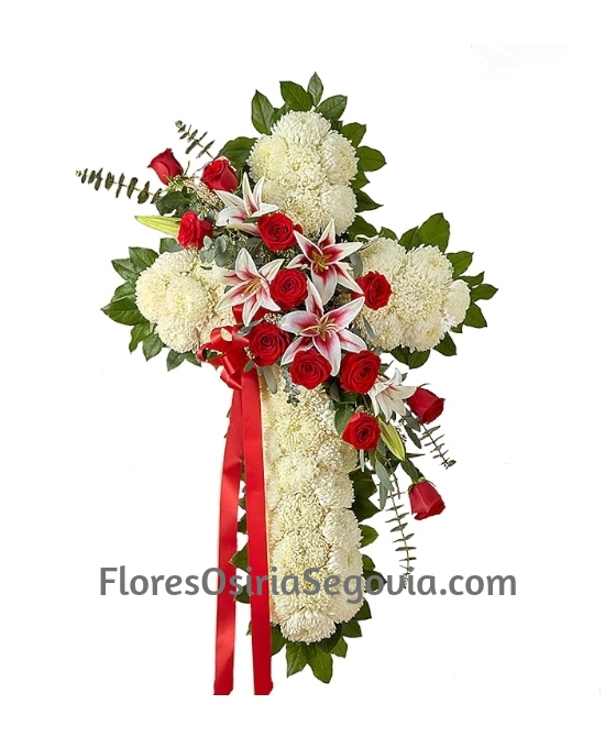 Bonita Cruz Funeraria de Clavel con rosas, realizado con flores para tanatorio, Esta bonita cruz de flores fúnebres, está decorado con crisantemos y rosas. Es una cruz de flores fúnebres, especialmente elegante y bonita. Nos indica el amor que se siente hacia la persona querida fallecida. Además, gracias al servicio de envío de flores a tanatorio, podrás recibir esta cruz de defunción en el momento indicado y acompañar el sentimiento de la familia del difunto. Además, puedes optar al envío urgente de flores para tanatorio con la compra de nuestros Arreglos Florales Clásicos.