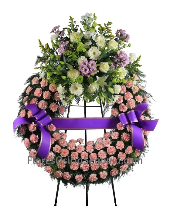 Delicada y exquisita, Corona Funeraria Basic. Delicada y exquisita. Con aro de claveles rosados. Y en la parte superior la adorna un hermoso cabecero de flor variada: salpicada de flores rosadas y blancas, como lilium, gerberas, margaritas, rosas y antirrhinum y bonitos verdes silvestres (Aro de 70-80 cm, con 1 cabezal, de 90 a 100 claveles, 8 margaritas, 4 liliums, 5 gerberas, 6 rosas tallo corto, 6 varas solidago, verdes variados y cinta funeraria). Si quiere comprar flores para funeral online nuestros trabajos funerarios están realizados siempre con flores para tanatorio frescas de primera calidad. En Floristería Osiria, tu Floristería de Segovia, somos floristas profesionales expertos en coronas de flores fúnebres. Dichas flores para tanatorio están suministradas por nuestros proveedores nacionales e internacionales. Por lo tanto, nuestros trabajos para funerales son siempre de una calidad excelente. Si quiere comprar flores para funeral, puede optar a nuestro servicio de envíos florales a tanatorios.