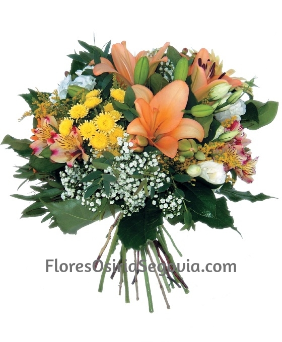 De entre nuestro ramos de flores de temporada, el Ramo Flores Lisboa, realizado en tonos alegres pero que nos reflejan los dulces colores del otoño, aporta un aire romántico y otoñal muy especial. Compuesto por flores silvestres como las margaritas, paniculata, alstromerias, lisianthums, y también por flores más especiales como es el lilium, realizado con colores otoñales y decorado con bonitos verdes que le dan ese aire tan alegre y bonito, que nos aboca al otoño, que es sin duda una estación de colores especiales. Es el ramo de regalo perfecto, que sin duda podemos hacer si lo que queremos es alegrar un día especial. Bonito ramo de flores de regalo que presenta nuestra floristería online, Floristería Osiria en Segovia.