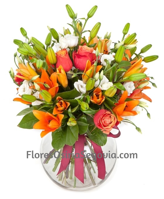 Ramo Flores Luxemburgo, bonito y alegre, realizado con lilium rosas, lisianthums, en tonos naranjas y decorado con verdes variados que le dan a este ramo de flores de regalo un aire silvestre y alegre a la vez. Tiene una calidez de colores especial, que se asemeja al verano y que seguro alegrará a la persona que lo reciba. Somos una floristería de Segovia de floristas profesionales dedicados al envío de flores, especialmente de flores para regalar. Además, hacemos entregas de ramos de flores donde lo precise.